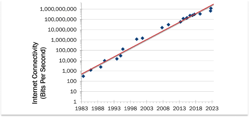 看下面这张图,关于过去 20 年中,互联网的数据传输速率如何从每秒不到 1000 比特增长为现在的每秒十亿比特以上。