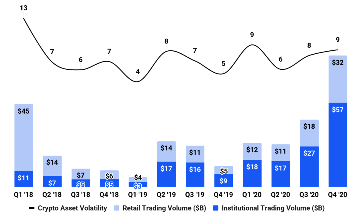 「交易所」的定位能够让 Coinbase 在资产价格波动的过程中获得红利。初期,参与交易的主要是个人投资者,而到了 2015 年以后,机构投资者也越来越多的加入进来。价格越是剧烈波动,这个市场就越能吸引那些想要从中赚钱的人进来,同时入场者的交易也越频繁。Coinbase 作为最易用、也最广为人知的 Crypto 交易所也就越容易吸引用户,并从这些用户的交易中获得佣金收入。