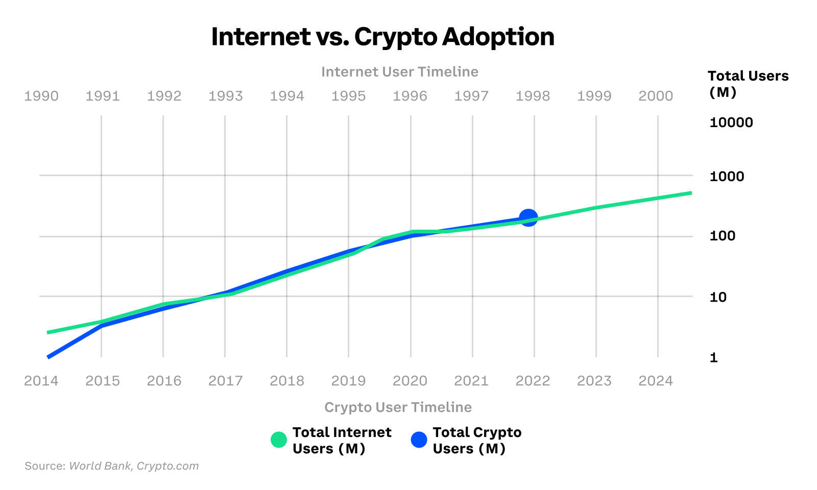We can observe the beginnings of this shift with the dramatic advancements in crypto participation in 2021. Total crypto market capitalization at the end of Q3 was ~$2.0 trillion, up from ~$800 billion at the end of 2020, driven by higher crypto asset values as well as the ongoing proliferation of crypto assets. Further, according to the World Bank and crypto.com, the number of crypto users globally doubled in the first half of 2021 to over 200 million — and the rate of user growth is accelerating. Bigger picture, the crypto adoption curve over its first decade is mirroring that of Internet adoption over a similar time period beginning in the late 1990s.