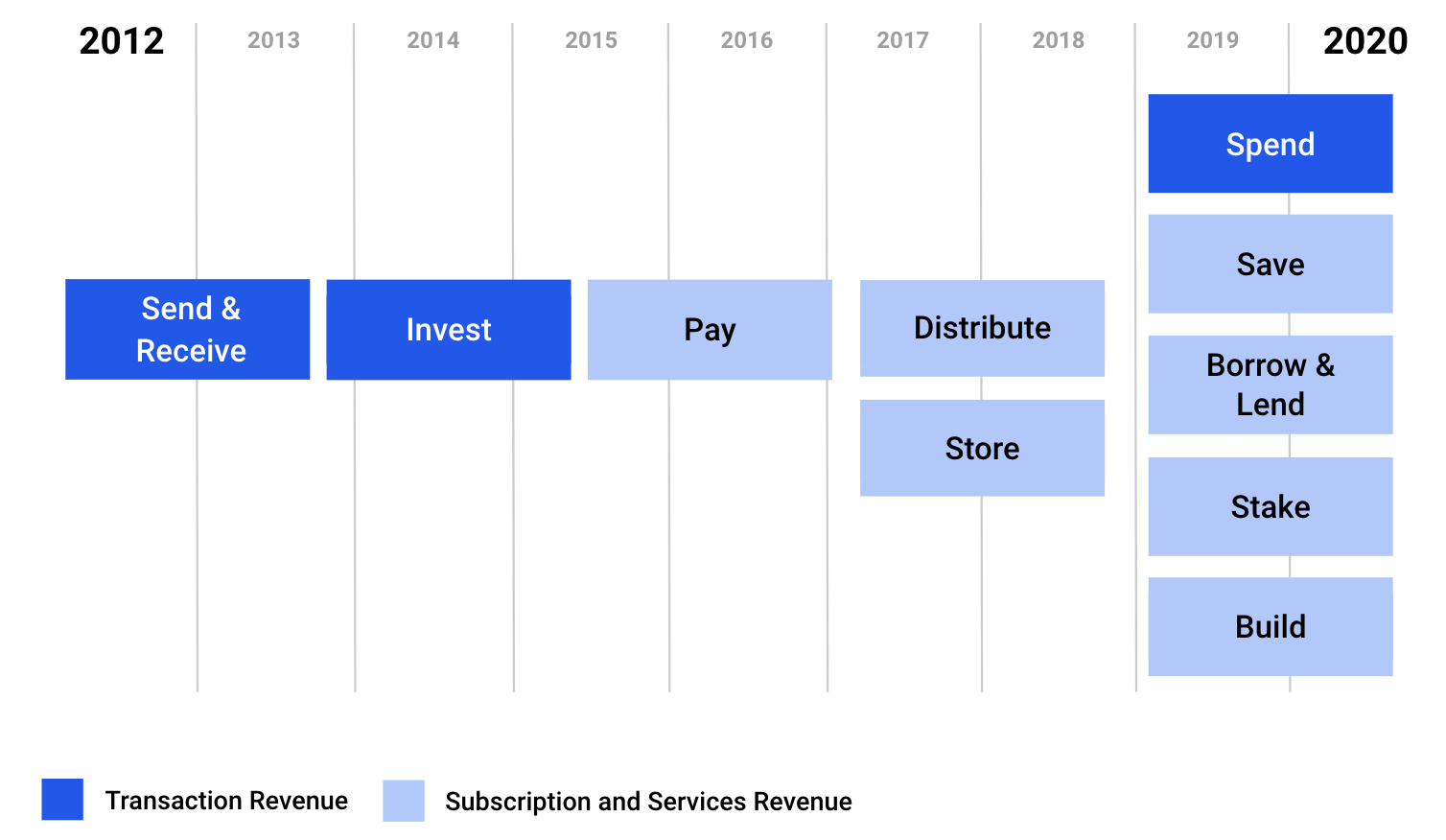 这就构成了 Coinbase 这家公司的价值基础。在 2014 年开始,Coinbase 开始面向个人和机构投资人持续推出「交易所」定位的投资产品,并在后续数年中不断增加可供交易的 Crypto 资产的数量。